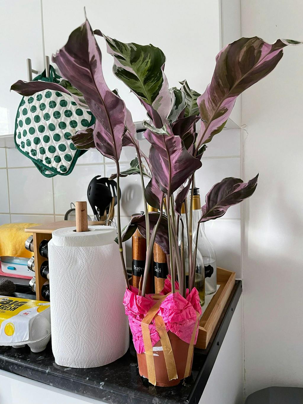 Thrives in bright, indirect light. Wipe down the leaves regularly to make sure it gets enough light- this can be tricky for such highly variegated leaves